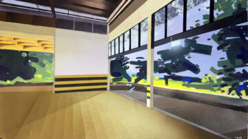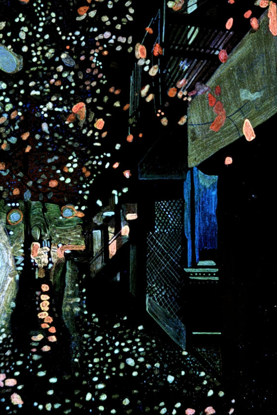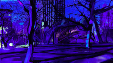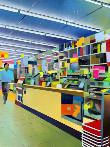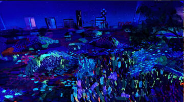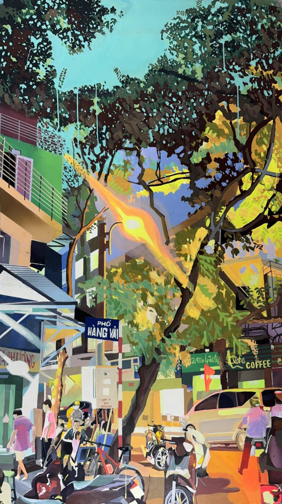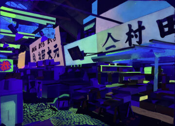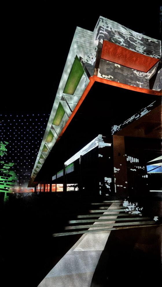 Acrylic gouache, fluorescent paint, glow-in-the-dark paint, colored pencil • 74cm x 132cm • Dec 2023
