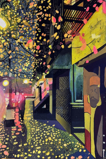 Acrylic gouache, collage, glow-in-the-dark paint • 61cm x 81cm • Aug 2023