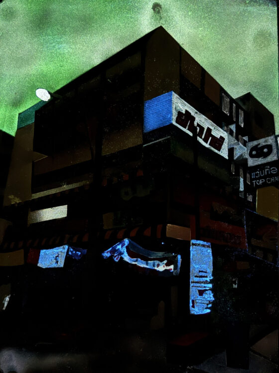 Acrylic gouache, collage, glow-in-the-dark paint • 46cm x 61cm • Jun 2025