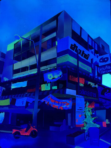 Acrylic gouache, fluorescent paint, glow-in-the-dark paint, colored pencil • 81cm x 61cm • Jun 2024