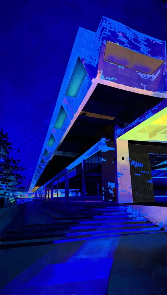 Acrylic gouache, collage, fluorescent paint, glow-in-the-dark paint • 81cm x 61cm • Sep 2025