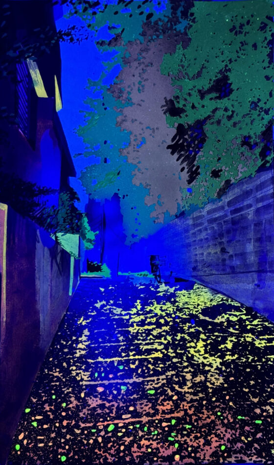 Acrylic gouache, glow in the dark paint • 61cm x 34cm • Jul 2025