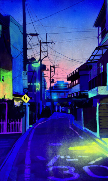 Acrylic gouache, colored pencil, glow in the dark paint • 15cm x 25cm • May 2022